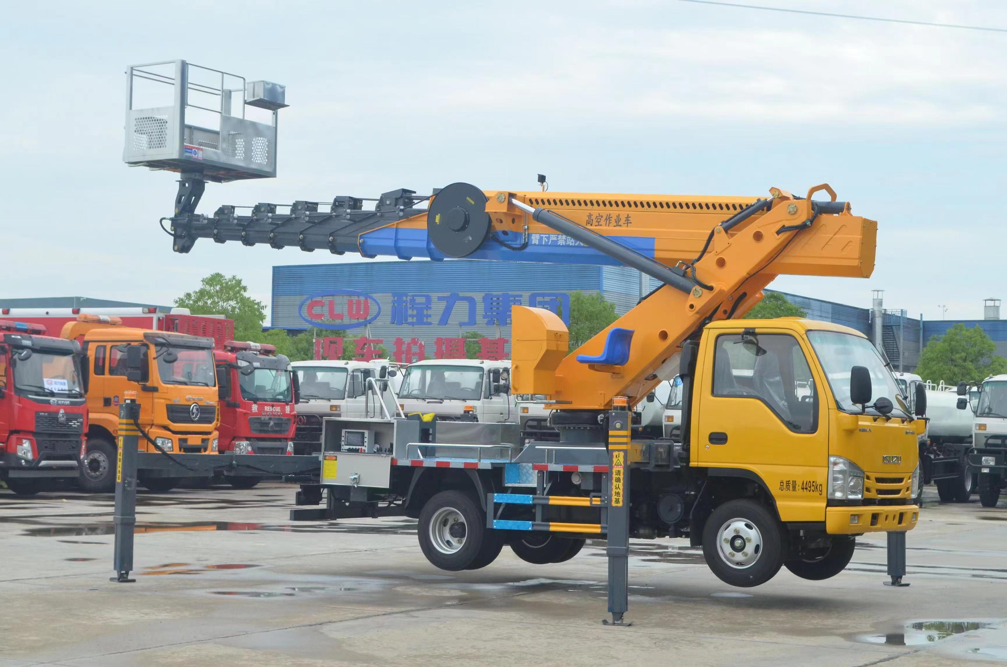 上裝配置 不銹鋼圍欄及防滑走臺板,高強度不銹鋼工作平臺 (尺寸:1600X700X1000mm),七節十四邊形型工作臂,同步伸縮,回轉裝置 360 度連續回轉,前 V 后 V 型支腿,單獨可調(控制),電控操作,另配有手動應急操作 控制系統,CAN 總線控制系統,配有無線遙控器、實現 無級調速,靜液自動調平; CL5045JGK6ADS 型高空作業車基本功能安全配置:作業車可以實現平臺載荷 200KG,最大作業高度 33 米,最大作業幅度 15 米。 上下車自動互鎖裝置,用于上下車互鎖,防止誤操作發生危險,手動應急泵,當發動機及主泵發生故障時,可通過應急系統將工作人員送回到地面及整車收回至行車狀態,工作平臺緊急停止 裝置,緊急動限制工作幅度,當工作幅度達到規定值時,自動限制危險方向工作;當出現支腿支地不實時(軟腿),舉升臂架將限制危險方向工作。(選配) 夜間安全警示裝置,在車輛上有工程頻閃燈,LED 照明燈發動機點火熄火,控制器可對發動機進行點火,熄火控制;被限制工作時,可通過“強制”功能拓展工作;